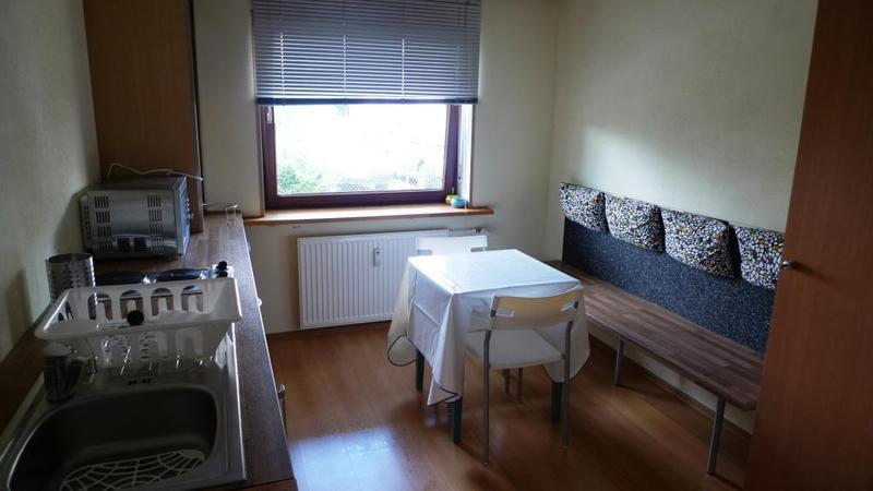 Wohnküche mit kleiner Küchenzeile, 2-Plattenherd, Kühlschrank, Mikrowelle mit Backfunktion, Komplett ausgestattet mit Koch- und Essgeschirr.